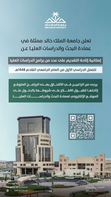 إعلان عن إمكانية إتاحة التقديم على عدد من برامج الدراسات العليا للفصل الدراسي الأول من العام الجامعي القادم 1448هـ